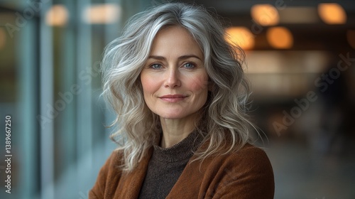 Portrait of a beautiful mature woman with gray hair smiling naturally and looking at the camera indoors
