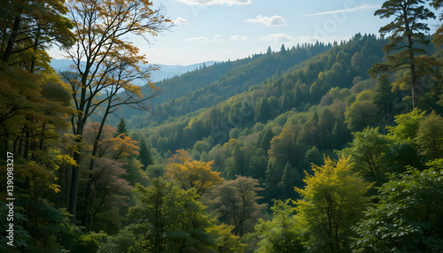 Lush Green Mountain Forest with Trees in Sunlight Landscape
