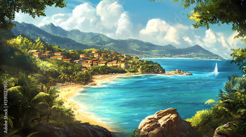Scenic island getaway, charming coastal town, tranquil bay. lush greenery, sandy beach, and azure water. perfect for relaxation and sightseeing. Enchanted Bay. Illustration