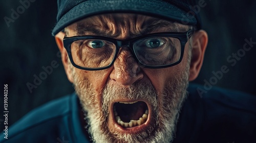 Angry old man shouting portrait close up with glasses and cap expression of rage and frustration face emotion