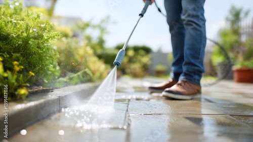 Person using a power washer to clean a garden path outdoors, surrounded by greenery and sunshine, creating a fresh look.