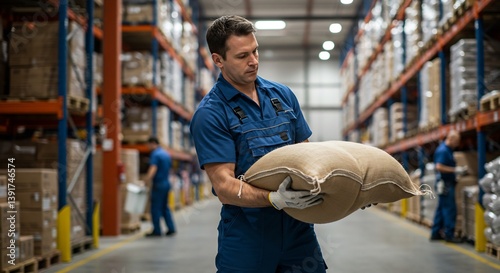 Warehouse Worker Carrying Heavy Sack of Goods in Industrial Facility
