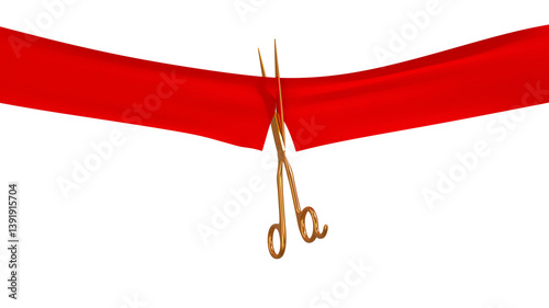 une paire de ciseaux dorés en train de couper un rubans rouge pour une inauguration - rendu 3D - Fond transparent
