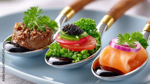 Gourmet amuse bouche trio served in tasting spoons with vibrant garnishes and elegant presentation