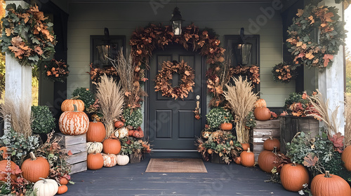 A festive front porch decorated with stacked pumpkins, cornstalks, and autumn wreaths.