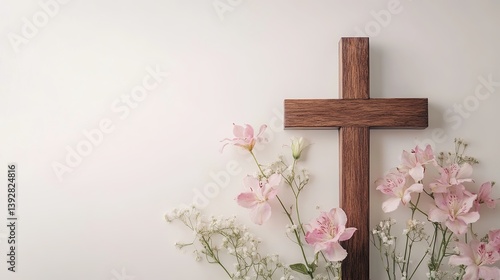 Wooden cross with pink flowers easter background christianity religious symbol faith hope love salvation god