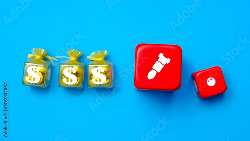 Top View of Money Bags and Dice Risk, Investment, and Fortune