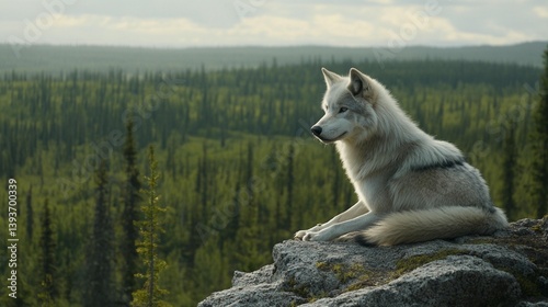 Majestic white wolf sits on a rock overlooking a vast boreal forest landscape.