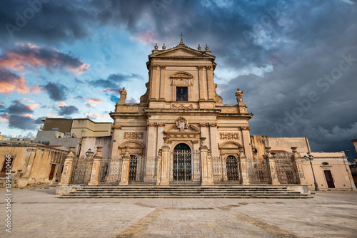 Ispica Sicily Italy. Church of Santa Maria Maggiore and loggiato del Sinatra