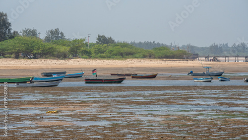 małe łodzie rybaków stojące na mieliźnie. codzienne odpływy oceanu uniemożliwiają rybakom swobodny połów ryb