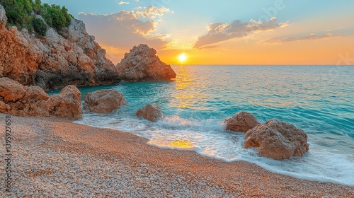 Serene sunset over a pebble beach, turquoise water lapping gently against the shore, rocks framing the scene