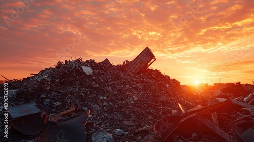 Scrap metal heap at recycling junk yard against red sky at sunset