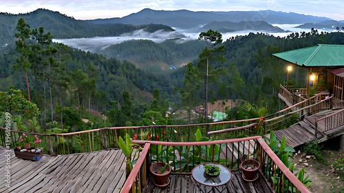 A mountaintop vista with a wooden deck and a rustic cabin.