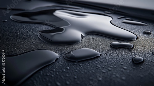 Water Drops On Black Metal Surface Abstract Background Of Close-Up Raindrops, Texture