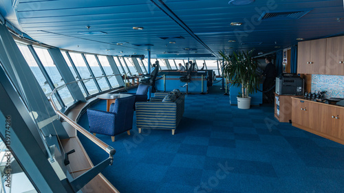 View from port wing looking towards helmsman position on bridge of large modern passenger cruise liner.