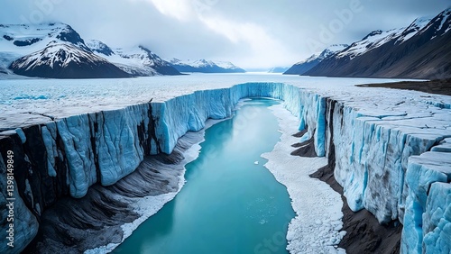 Aerial view of a glacial canyon with turquoise meltwater flowing between steep ridgelines