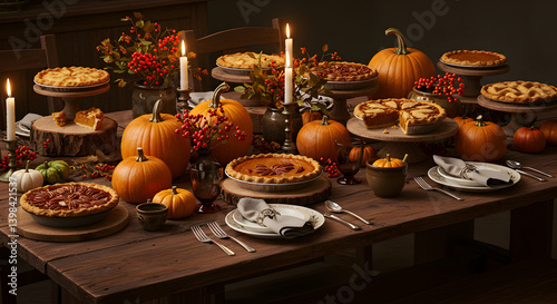 Thanksgiving Dinner Table With Pumpkins Pies And Candles In Autumn Setting