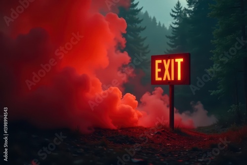 Fiery exit sign in smoky environment, urgent escape route, texture, escape