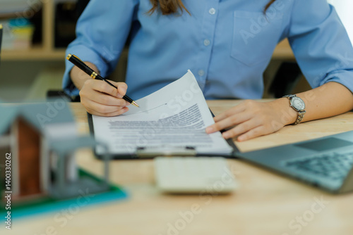 A female agent showcases the property and walks the client through the insurance cost calculation in an effort to sell a home insurance policy.