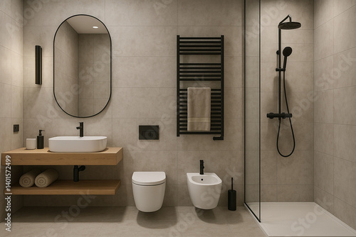 The modern bathroom interior is designed in a minimalist style. The room is complemented by a wooden hanging cabinet with a white sink, black faucets and a stylish shower corner with a tropical shower