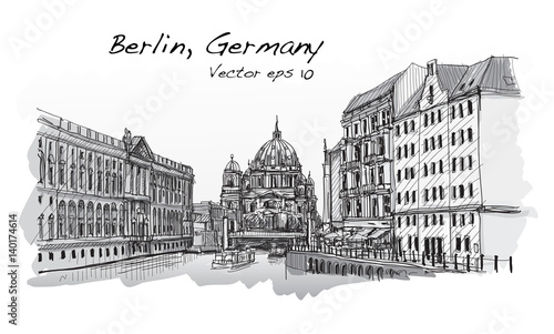 Cityscape in Germany. Berlin Cathedral. Old building hand drawn sketch, vector illustration