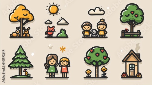 A charming set of 15 outline icons showcasing lighthearted family activities and moments in nature from playing in a park to a cozy home setting