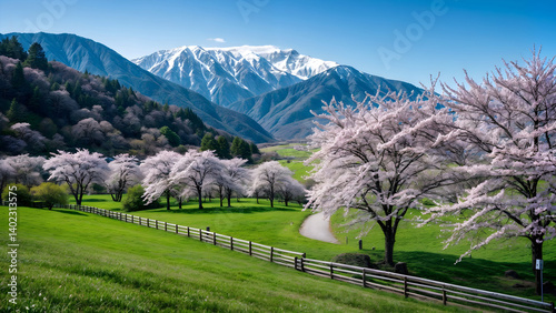A serene landscape with cherry blossom trees and a majestic mountain under a bright blue sky.