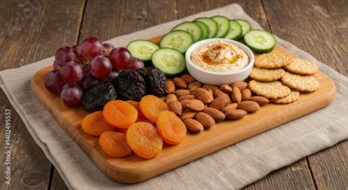 Snack board with grapes cucumbers dried fruit almonds hummus and crackers.