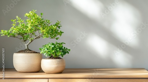 A delightful duo of bonsai plants in tasteful pots creates a charming tableau, perfect for evoking feelings of serenity and bringing natural beauty into home decor settings.