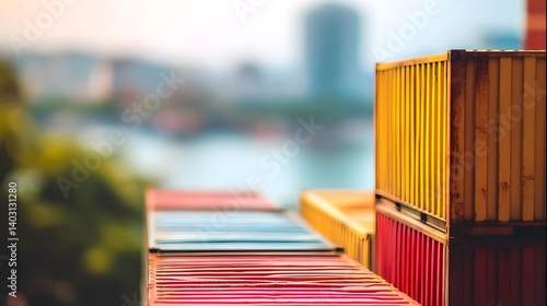 Stacked shipping containers at port representing global trade and logistics, concept of import export business and international commerce