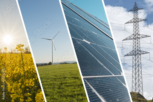 Ökologische Energie Hintergrund mit Solarpanel, Windmühle, Rapsfeld und Strommasten - Nachhaltige Energie Collage