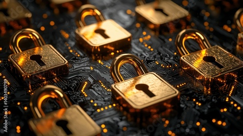 Cybersecurity: Digital Fortress, Data Protection, Golden Padlocks on Circuit Board, Network Security, Data Encryption, Technological Safeguard, Digital Privacy, Online Security