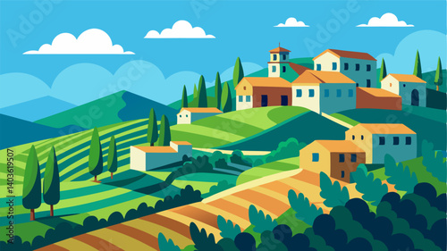 Olive groves dotting the terraced landscape creating a patchwork of varying shades of green against a backdrop of bright blue skies and terracottaroofed houses.