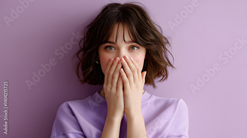 A surprised young woman covers her mouth, expressing surprise with her hands, in front of a purple backdrop.