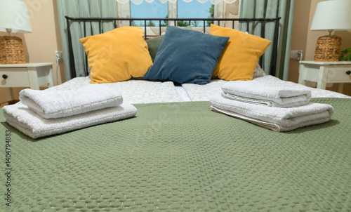 Pościelone łóżko w sypialni, ręczniki, poduszki i narzuca na łóżku