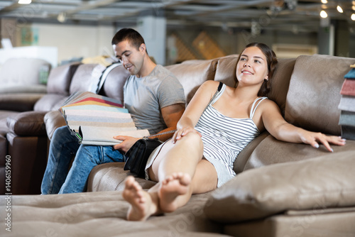 Couple choose soft corner in furniture store.On brown sofa,wife comfortably settled down with legs to test comfort of sofa in use.Husband examines set of upholstery fabric samples