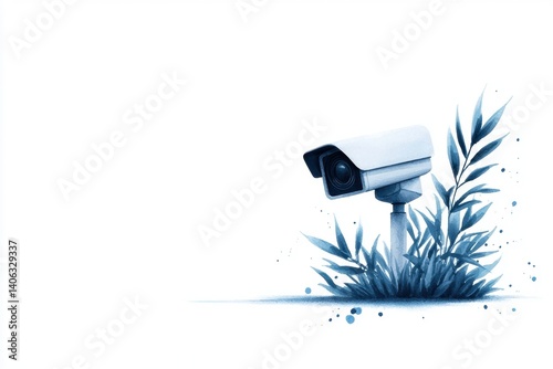 A security camera surrounded by lush green foliage, blending technology with nature.