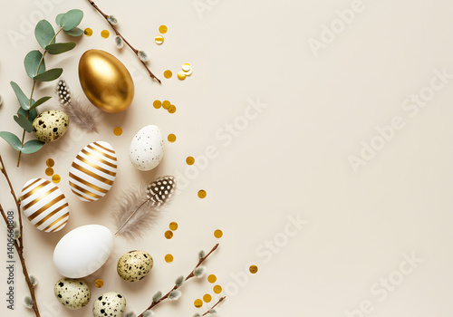 Arrangement of golden and speckled Easter eggs with greenery and branches for celebration