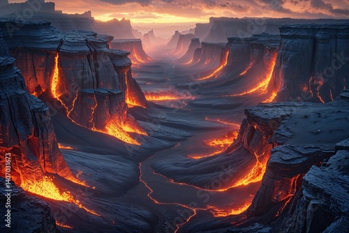 Dramatic Landscape of Rocky Formations with Fiery Fissures and Luminous Effects
