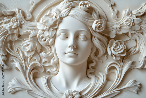 Carved image of an elegant bas relief on a textured wall with gypsum generative AI technology