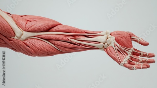 Human forearm anatomy skeletal structure and radiology concept. Anatomical depiction of human arm muscles and skeleton structure.