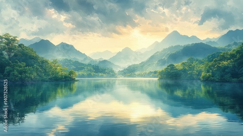 Aerial View of Serene Lake Surrounded by Lush Green Hills in Early Morning Light