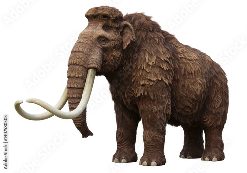 Isolated woolly mammoth standing with long curved tusks and thick brown fur on a white background