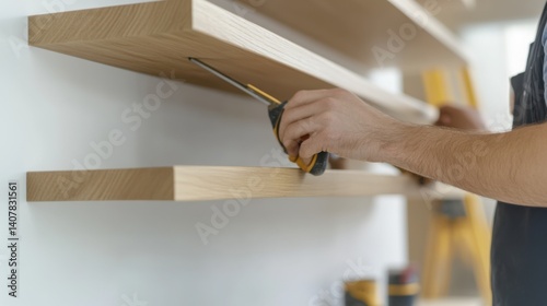 Carpenter installing wooden shelves in a modern living room. Featuring precision and home improvement