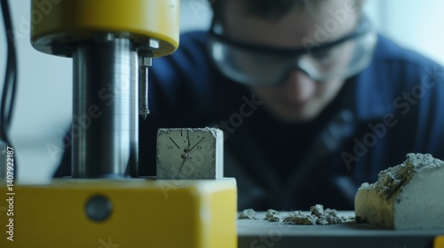 Structural engineer testing concrete strength using a hydraulic pressure machine. Featuring assessment and durability