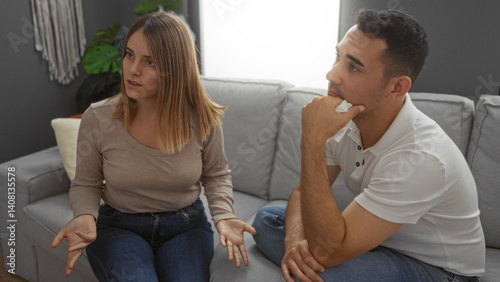 Couple sitting on a gray sofa in a cozy living room, woman gesturing expressively while man listens attentively, suggesting a meaningful conversation indoors.
