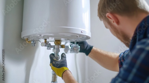 Plumber replacing a hot water heater in a utility room. Featuring technical expertise and precision