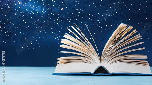 Open book under starry sky expanding cognition of space concept. An open book against a starry sky representing knowledge and wonder.