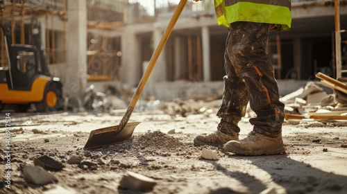 A construction worker removing debris at a construction site. Featuring hard work and cleanliness