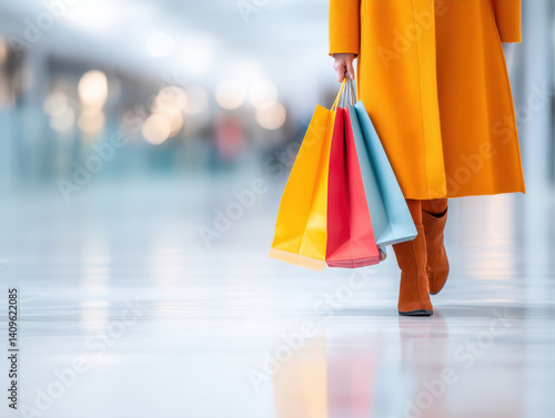 person enjoys shopping while carrying colorful bags in bright coat, creating cheerful atmosphere in modern mall